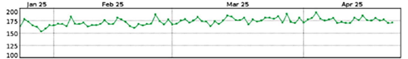 No sudden change in impedance; the most recent 28-day average LVSI is about 180Ω