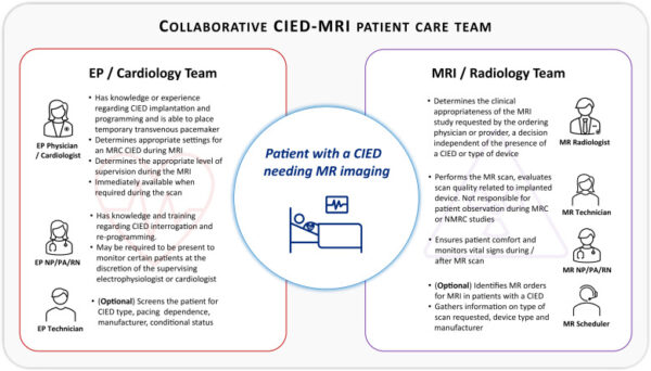 Figure 1. The HRS collaborative cardiology-radiology CIED-MRI team illustrates a multidisciplinary care model, outlining the roles of electrophysiologists, cardiologists, radiologists, advanced practice providers, and technical staff in coordinating safe and efficient MRI access. This model highlights shared responsibility for patient evaluation, device management, imaging execution, and monitoring.